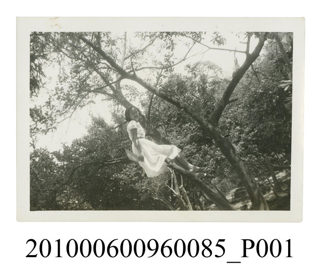 1.本文物為一女子坐於樹幹間獨影之照片,照片中女子身穿短袖連身長裙,腰間細有腰帶,腳穿拖鞋,爬上樹木,坐在樹幹之間拍照。屬於物件編號2010.006.0096「屏東女中林德泉老師之家庭相簿」內的相片。2.照片景物據鄭冠榮老師、王德明老師、陳萬足女士之訪談,應為屏東女中校園,屏東女中過去曾為農林實驗所,校園內種植許多熱帶植物,學生經常在校園拍照。
