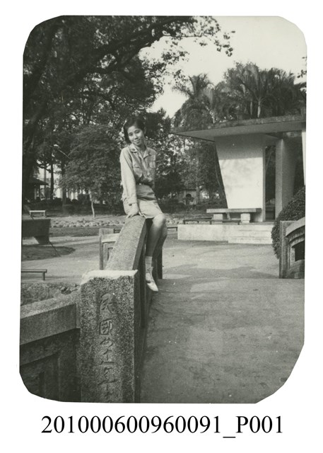 1.本文物為一女子坐於橋面水泥欄杆獨影之照片,照片中短髮女子身穿制服,腰間繫有腰帶,腳穿白襪白鞋,坐於橋面水泥欄杆,頭微傾面帶微笑朝向鏡頭。屬於物件編號2010.006.0096「屏東女中林德泉老師之家庭相簿」內的相片。2.照片人物據鄭冠榮老師、王德明老師、陳萬足女士之訪談,推測為屏東女中體育老師林德泉老師的小女兒林真珠。