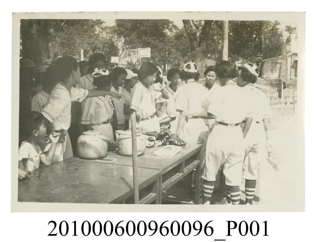 二位女子於臺灣省第二十一屆全省運動會壘球比賽場活動拱門前合影之照片