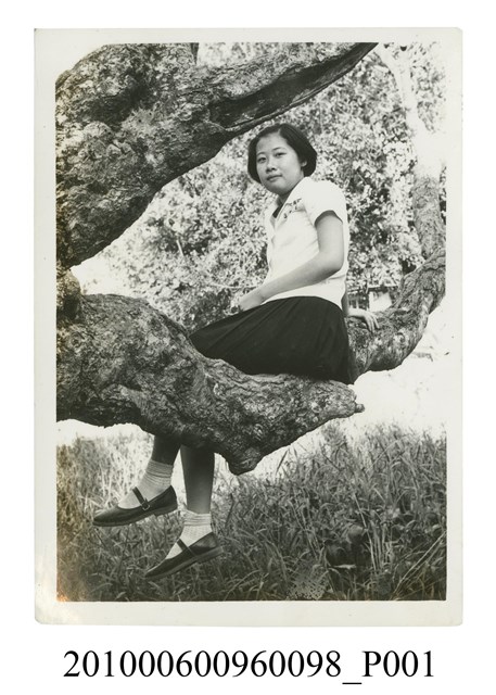 1.本文物為一身穿屏女制服女子獨影之照片,照片中女子身穿屏東女中制服,腳穿白長襪平底鞋,側身坐於樹幹上拍照。屬於物件編號2010.006.0096「屏東女中林德泉老師之家庭相簿」內的相片。2.屏東女中創建於昭和7年(1932)4月1日,校名為「高雄州立屏東高等女學校」,設置目的為給臺糖日籍員工的子女就讀,修業年限為4年。戰後曾設立初中部、高中部。現今為國立屏東女子高級中學。