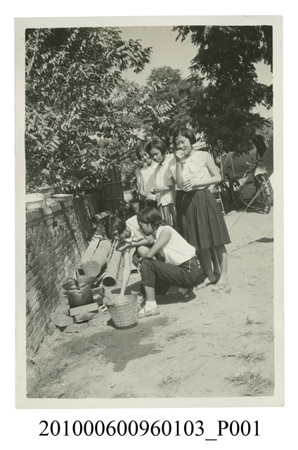 1.本文物為一群女學生排隊等待熱水煮沸之剪影,照片中2位蹲在地上的女子用簡易的爐灶煮開水,身後一排女子排隊等待開水沸騰。屬於物件編號2010.006.0096「屏東女中林德泉老師之家庭相簿」內的相片。2.照片畫面據鄭冠榮老師、王德明老師、陳萬足女士之訪談,推測為民國4、50年代學生於屏東女中露營地露營野炊的畫面,當時屏東女中露營地設置於學校操場旁。