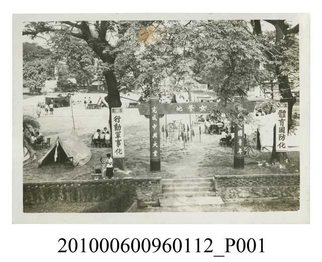 1.本文物為俯視屏女營地場地之照片,照片中為屏東女中舉辦露營之營地,入口處有一拱門,橫幅貼有「屏女營地」四大字,左右兩側柱上標語「團結愛國青年」、「完成中興大業」,拱門旁樹幹亦掛有標語「體育國防化」、「行動軍事化」。以俯視的角度可以看到場地內學員的活動情形。屬於物件編號2010.006.0096「屏東女中林德泉老師之家庭相簿」內的相片。2.照片畫面據鄭冠榮老師、王德明老師、陳萬足女士之訪談,推測為民國4、50年代的屏東女中露營地,當時屏東女中露營地設置於學校操場旁。