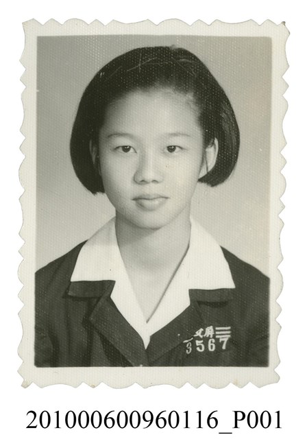 1.本文物為著屏女制服學號3567之女子半身正面照,照片中女子身穿屏女制服,於左胸口位置繡有屏女字樣及學號3567,身體朝向正面,眼神直視前方,拍攝胸口以上半身正面照。屬於物件編號2010.006.0096「屏東女中林德泉老師之家庭相簿」內的相片。2.照片人物據鄭冠榮老師、王德明老師、陳萬足女士之訪談,其學號應屬於民國40年代的學生。3.屏東女中創建於昭和7年(1932)4月1日,校名為「高雄州立屏東高等女學校」,設置目的為給臺糖日籍員工的子女就讀,修業年限為4年。戰後曾設立初中部、高中部。現今為國