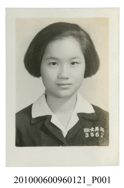 1.本文物為著屏女制服學號3562之女子半身正面照,照片中女子身穿屏女制服,於左胸口位置繡有屏女字樣及學號3562,身體朝向正面,眼神直視前方,拍攝胸口以上半身正面照。屬於物件編號2010.006.0096「屏東女中林德泉老師之家庭相簿」內的相片。2.照片人物據鄭冠榮老師、王德明老師、陳萬足女士之訪談,其學號應屬於民國40年代的學生。3.屏東女中創建於昭和7年(1932)4月1日,校名為「高雄州立屏東高等女學校」,設置目的為給臺糖日籍員工的子女就讀,修業年限為4年。戰後曾設立初中部、高中部。現今為國立屏東女子高級中學。