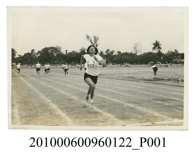1.本文物為女學生別有號碼布057跑步競賽之照片,照片中女學生身穿印有「屏女」字樣的運動服,身前別有號碼布057號,奮力的向前奔跑。屬於物件編號2010.006.0096「屏東女中林德泉老師之家庭相簿」內的相片。2.屏東女中創建於昭和7年(1932)4月1日,校名為「高雄州立屏東高等女學校」,設置目的為給臺糖日籍員工的子女就讀,修業年限為4年。戰後曾設立初中部、高中部。現今為國立屏東女子高級中學。