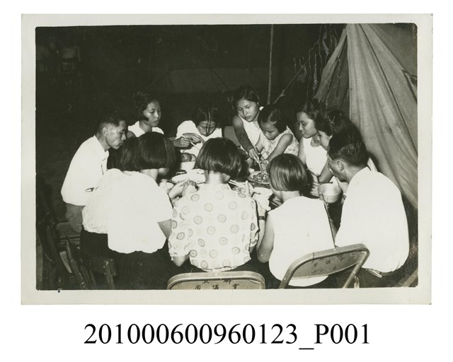 1.本文物為一群人用餐之照片,照片中大家開心的圍坐成一圈,享用桌上的食物,照片右側有一頂帳篷。屬於物件編號2010.006.0096「屏東女中林德泉老師之家庭相簿」內的相片。2.照片畫面據鄭冠榮老師、王德明老師、陳萬足女士之訪談,推測為民國4、50年代學生於屏東女中露營地露營野炊的畫面,當時屏東女中露營地設置於學校操場旁。