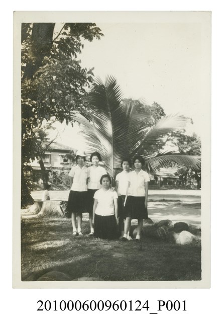 四位女子身穿傳統服飾依偎在欄杆旁合影之照片