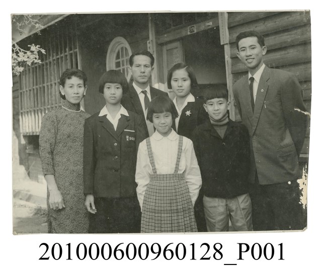 1.本文物為7人著正裝站立於屋外合影之照片,照片中右一男子身穿西裝,雙手放於身後;右二男童身穿高領針織衣搭配外套及長褲;前排中間女孩身穿有領白色襯衫搭配吊帶格紋裙;左一婦人身穿花色高領連身裙,脖子戴一串珍珠;左二女子身穿屏女制服;後排左一男子身穿西裝;後排右一女子身穿有領襯衫搭配外套,外套左胸口有一裝飾。7人正面朝向鏡頭拍照留影。屬於物件編號2010.006.0096「屏東女中林德泉老師之家庭相簿」內的相片。2.照片人物據鄭冠榮老師、王德明老師、陳萬足女士之訪談,推測為屏東女中體育老師林德泉老師與家人在宿舍前庭院合影。老師一家人居住在屏東女中日式教職員宿舍,故推斷拍照地點為宿舍前。