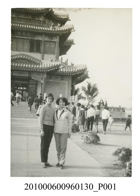 1.本文物為2位女子於高雄澄清湖得月樓前合影之照片,照片中右側女子身穿圓領衣物搭配外套,長褲及包鞋,站姿身體微偏右側;左側女子身穿高領針織毛衣,長褲及平底包鞋,站姿身體微偏左側。2人互擁站立於得月樓前拍照留影。屬於物件編號2010.006.0096「屏東女中林德泉老師之家庭相簿」內的相片。2.照片人物據鄭冠榮老師、王德明老師、陳萬足女士之訪談,推測右手邊的女子為屏東女中體育老師林德泉老師小女兒林真珠。3.高雄澄清湖得月樓,建於湖畔中,結合清宮頤和園千秋亭及佛香閣之形式,並有武昌黃鶴樓之風格,用色均照清代宮廷建築規格,紅綠相間,富麗堂皇,民國六十年間改為歷史文物陳列室,由國立歷史博物館複製歷代代表性之文物,上自商周,下迄明清,有銅器、陶器、瓷器、玉器、漆器百餘件,琳瑯滿目,美不勝收。惟參觀遊客不多,故於85年5月1日起封館閒置。現今委外經營。