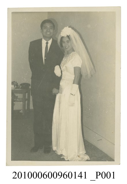 1.本文物為結婚照片,頭披白紗著白裙女子挽著著西裝男子站立合影之照片,照片中男子身穿西裝,梳油頭,打扮非常正式;女子頭披白紗,身穿白裙,右手挽著男子,2人露齒微笑面向鏡頭拍照。為物件編號2010.006.0096「屏東女中林德泉老師之家庭相簿」內的相片;物件編號2010.006.0096.0018、0079、0141應屬於一系列照片,照片人物相同。2.照片人物據鄭冠榮老師、王德明老師、陳萬足女士之訪談,推測為屏東女中體育老師林德泉老師的大女兒林純珠結婚照。