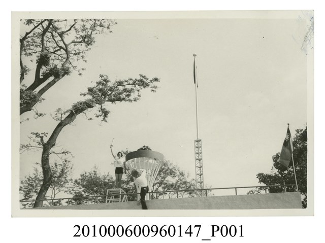 1.本文物為點燃聖火之剪影,照片中一女性運動員右手持火把,站立於聖火臺旁,點燃聖火,旁有一攝影師負責捕抓畫面。屬於物件編號2010.006.0096「屏東女中林德泉老師之家庭相簿」內的相片。2.照片景物據鄭冠榮老師、王德明老師、陳萬足女士之訪談,推測應為屏東中山公園(現稱屏東公園)的聖火臺。時間可能為民國55年10月25日至10月30日在屏東舉辦的第21屆臺灣省運動會。