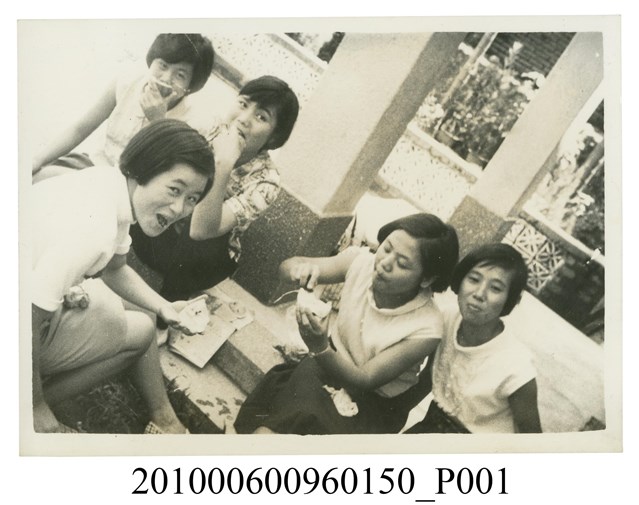 1.本文物為5位女子在戶外活動之剪影,照片中5位女子坐在階梯,互相分享食物,毫無準備的滑稽表情被攝影師捕捉到,十分自然生動的畫面。屬於物件編號2010.006.0096「屏東女中林德泉老師之家庭相簿」內的相片。2.照片人物據鄭冠榮老師、王德明老師、陳萬足女士之訪談,推測為屏東女中體育老師林德泉老師小女兒林真珠與朋友的合影。