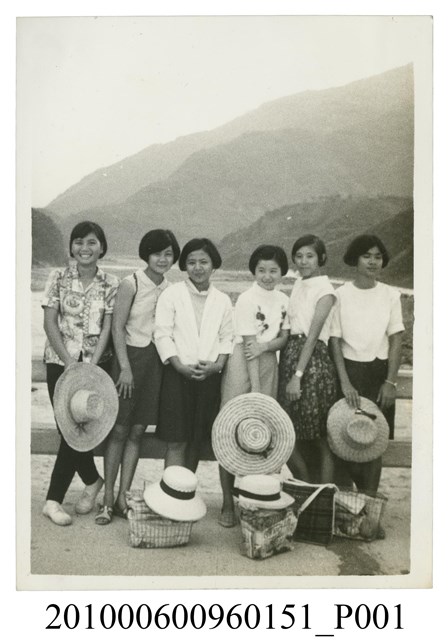 1.本文物為6人於戶外合影之照片,照片中6位女子穿著休閒,有的人手持遮陽帽,有的人將遮陽帽與包包一同放置在地上,擺出優雅姿勢拍照留影,照片背景為層層山巒。屬於物件編號2010.006.0096「屏東女中林德泉老師之家庭相簿」內的相片。2.照片人物據鄭冠榮老師、王德明老師、陳萬足女士之訪談,推測為屏東女中體育老師林德泉老師小女兒林真珠與朋友的合影。