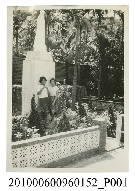 1.本文物為2位女子依靠在聖母像基座合影之照片,照片中2位短髮女子身穿短袖上衣搭配短裙,身體依靠在聖母像基座,面朝向鏡頭拍照。雕像四周用矮磚牆圍起一個區塊,內種有許多植栽。屬於物件編號2010.006.0096「屏東女中林德泉老師之家庭相簿」內的相片。2.照片人物據鄭冠榮老師、王德明老師、陳萬足女士之訪談,推測為屏東女中體育老師林德泉老師小女兒林真珠與朋友在屏東萬金天主堂的合影。