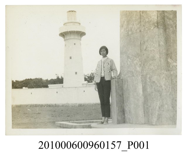 1.本文物為一女子於鵝鑾鼻燈塔前獨影之照片,照片中一女子身穿花色外套搭配長褲,依靠在柱子旁,與身後的鵝鑾鼻燈塔拍照留影。屬於物件編號2010.006.0096「屏東女中林德泉老師之家庭相簿」內的相片。2.照片人物據鄭冠榮老師、王德明老師、陳萬足女士之訪談,推測為屏東女中體育老師林德泉老師的小女兒林真珠。3.鵝鑾鼻燈塔興建於西元1881年,位於屏東縣鵝鑾鼻岬角,塔身為白色鐵造圓塔,是臺灣本島最南的燈塔。燈樓面向西南方,背山臨海,並構築成砲壘形式,圍牆有射擊的槍眼,四周並築壕溝,為全國獨一無二的武裝燈塔。民國51年改建時,換上國內光力最強的旋轉透鏡電燈,使得鵝鑾鼻燈塔不僅是國內光程最遠的燈塔,還享有「東亞之光」的美譽。目前成為墾丁國家公園觀光勝地之一環,其地左瀕太平洋,面對巴士海峽,與菲律賓之呂宋島遙遙相對,於民國81年起(1992)開放給民眾參觀。
