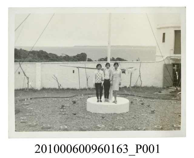 1.本文物為3位女子站於鵝鑾鼻燈塔旁一旗桿座合影之照片,照片中右側女子身穿長袖格紋連身裙,中間及左側女子皆身穿褲裝,中間女子勾著左右側女子的左右手,站立在旗竿圓型底座拍照留影。屬於物件編號2010.006.0096「屏東女中林德泉老師之家庭相簿」內的相片。2.照片人物據鄭冠榮老師、王德明老師、陳萬足女士之訪談,推測為屏東女中體育老師林德泉老師小女兒林真珠與朋友的合影。3.鵝鑾鼻燈塔興建於西元1881年,位於屏東縣鵝鑾鼻岬角,塔身為白色鐵造圓塔,是臺灣本島最南的燈塔。燈樓面向西南方,背山臨海,並構築成砲壘形式,圍牆有射擊的槍眼,四周並築壕溝,為全國獨一無二的武裝燈塔。民國51年改建時,換上國內光力最強的旋轉透鏡電燈,使得鵝鑾鼻燈塔不僅是國內光程最遠的燈塔,還享有「東亞之光」的美譽。目前成為墾丁國家公園觀光勝地之一環,其地左瀕太平洋,面對巴士海峽,與菲律賓之呂宋島遙遙相對,於民國81年起(1992)開放給民眾參觀。