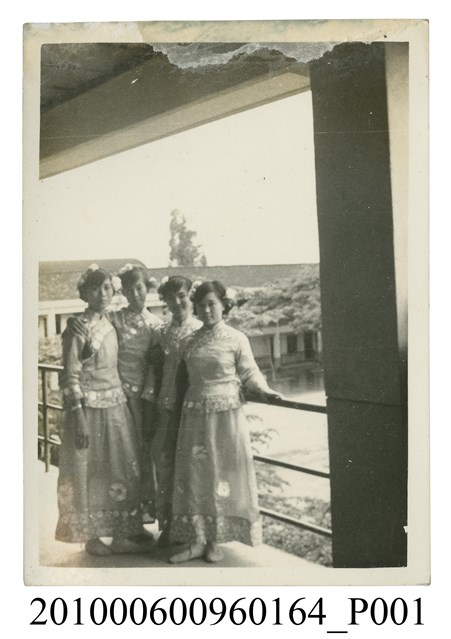 四位女子身穿傳統服飾依偎在欄杆旁合影之照片