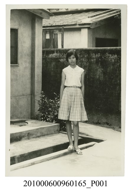 1.本文物為一女子站立於排水溝旁獨影之照片,照片中女子身穿無袖有領上衣,搭配格紋裙裝,腰間繫有腰帶,雙手自然垂放,站立於屋外排水溝旁拍照留影,身後有一堵牆及建物。屬於物件編號2010.006.0096「屏東女中林德泉老師之家庭相簿」內的相片。2.照片人物據鄭冠榮老師、王德明老師、陳萬足女士之訪談,推測為屏東女中體育老師林德泉老師的小女兒林真珠。