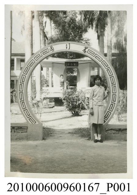 二位女子於臺灣省第二十一屆全省運動會壘球比賽場活動拱門前合影之照片