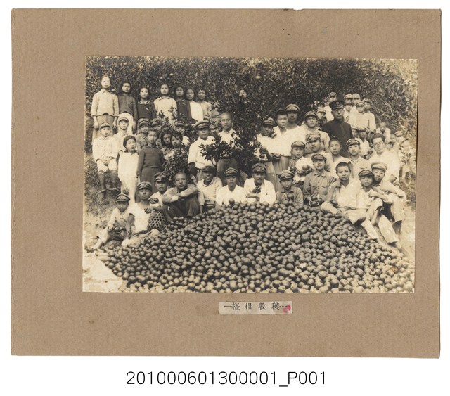 1.本物件是芎林農業專修學校畢業生紀念相簿中椪柑收穫的照片。照片背景為柑橘園,近景為堆積如山的椪柑。學校師生在柑橘園前合影,其中,右上部著黑色制服者,為校長近井泰;前面第二排最右未戴帽者,為助教諭關谷計治。照片下方貼有「椪柑收穫」字樣標籤,照片背面按師生位置註記師生姓名。