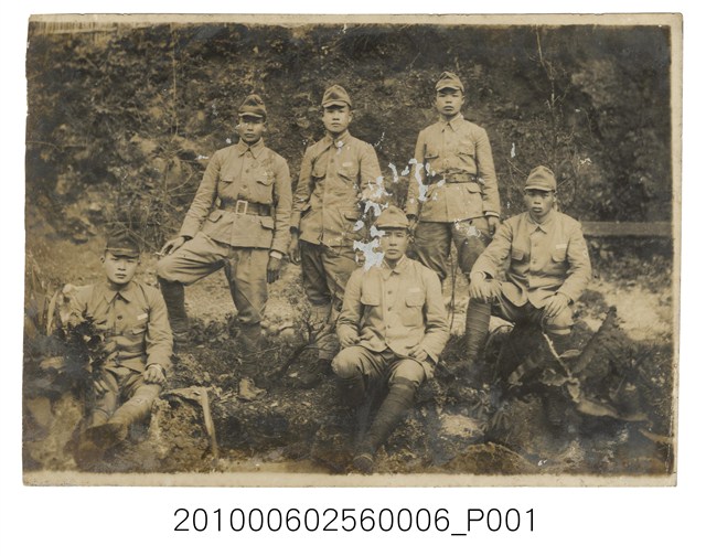 本物件為一張黑白照片,背景在山裡(或是荒地),有6名軍人在此採隨意姿勢拍照,根據服裝推斷,應為日治時期的士兵,但無法判別軍種。拍照的時刻推測應該非訓練時間,左邊第二排站著的男子右手刁了一根菸,有些人沒有繫皮帶,服儀沒有要求,但全部都有戴帽子,身上卻沒有配戴武器,推測為休息時間所拍的照片。照片背面泛黃嚴重,正面在中間有破損。