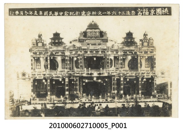 1. 本物件為桃園景福宮建醮之黑白照。照片中央為三層式醮壇,張燈結采,十分華麗。醮壇前有許多往來的香客。照片上方寫「桃園景福宮恭逢三十六年一次祈安建醮紀念中華民國辛丑年冬月舉行」。2. 桃園景福宮,主祀開漳聖王,因清代嘉慶年間此地時常有瘟疫,墾首薛啟隆乃倡議建廟,於嘉慶16年(1811)擇定現址興建,名為「景福宮」,景福宮歷經日治、戰後的修建而成今日的規模。廟的主體共有兩進,面寬9間,中央有天井,廟內保留嘉慶年間的匾額。