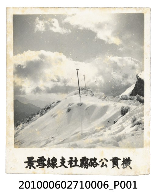 1. 本物件為橫貫公路霧社支線之黑白照。照片為一被雪覆蓋的斜坡,斜坡頂端有兩根電線桿,天空飄散白雲。照片下方寫「橫貫公路霧社支線雪景」。2. 霧社支線,為中部橫貫公路的支線。中部橫貫公路東起太魯閣、西至東勢,以梨山為分界點,東段屬立霧溪流域,西段為大甲溪流域,大禹嶺海拔2565公尺為最高點,為霧社支線的分岔點。