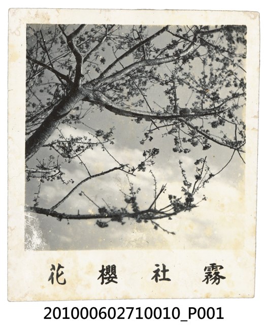 1. 本物件為霧社櫻花之黑白照。拍攝視角為仰角拍攝盛開的櫻花,枝椏間映襯著天空與雲朵,構圖十分漂亮。照片下方寫「霧社櫻花」。2. 霧社地區,因此地時有山嵐霧氣而得名「霧社」,指今日南投縣仁愛鄉。其海拔高度約1150公尺,有臺灣櫻都之稱,以緋寒櫻為主,以及霧社櫻、富士櫻等。