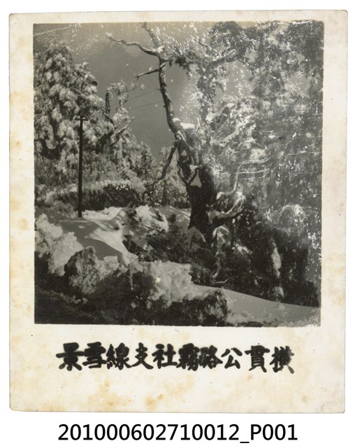 1. 本物件為橫貫公路霧社支線之黑白照。樹上與地面均覆蓋著厚厚的雪,左方隱約可見電線桿與電線。照片下方寫「橫貫公路霧社支線雪景」。2. 霧社支線,為中部橫貫公路的支線。中部橫貫公路東起太魯閣、西至東勢,以梨山為分界點,東段屬立霧溪流域,西段為大甲溪流域,大禹嶺海拔2565公尺為最高點,亦為霧社支線的分岔點。