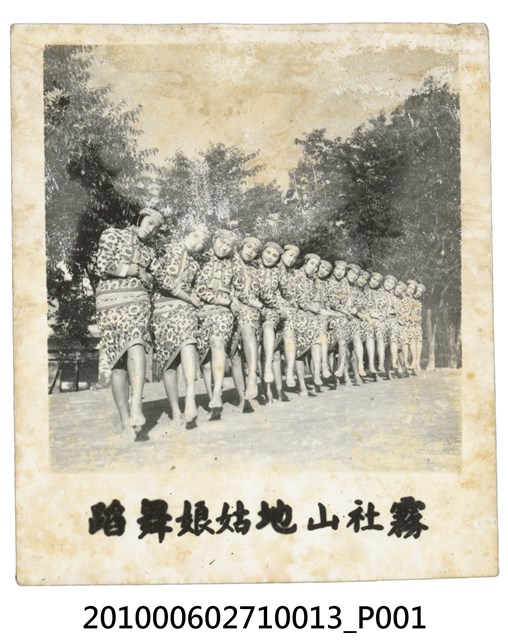 1. 本物件為霧社原住民之黑白照。照片中有十六名原住民女子手牽手排列成隊,額上繫頭帶,身著似向日葵紋服裝,赤腳單腳站立。照片下方寫「霧社山地姑娘舞蹈」。2. 霧社地區,因此地時有山嵐霧氣而得名「霧社」,指今日南投縣仁愛鄉。霧社位於濁水溪與眉溪支流合望溪的脊稜臺地上,境內的原住民族以賽德克族、布農族與泰雅族為主。