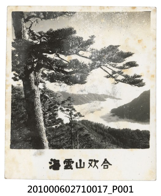 1. 本物件為合歡山雲海之黑白照。前方為一棵松樹,左後方為松樹林,後方可見雲海及露出雲海的山頂。照片下方寫「合欢山雲海」。2. 合歡山,合歡山國家森林遊樂區位於花蓮縣與南投縣交界,海拔高2300至3400公尺,面積457.61公頃,是全臺最高之國家森林遊樂區。
