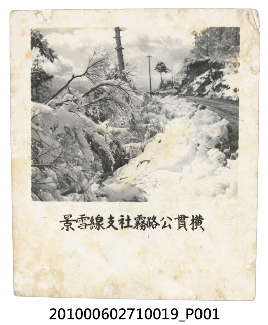 1. 本物件為橫貫公路霧社支線之黑白照。照片右方為橫貫公路,公路右側為山壁,左側為斜坡,均覆厚雪。公路旁設有電線桿。照片下寫「橫貫公路霧社支線雪景」。2. 霧社支線,為中部橫貫公路的支線。中部橫貫公路東起太魯閣、西至東勢,以梨山為分界點,東段屬立霧溪流域,西段為大甲溪流域,大禹嶺海拔2565公尺為最高點,亦為霧社支線的分岔點。