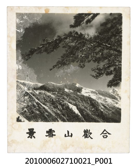 1. 本物件為合歡山雪景之黑白照。照片右上方為延伸至畫面的枝葉,映襯後方的合歡山,山上積雪未融。照片下寫「合歡山雪景」。2. 合歡山,合歡山國家森林遊樂區位於花蓮縣與南投縣交界,海拔高2300至3400公尺,面積457.61公頃,是全臺最高之國家森林遊樂區。