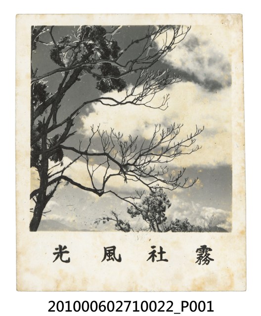 1. 本物件為霧社之黑白照。由樹木枝椏間拍攝後上方的天空與雲層,顯出剪影效果。照片下寫「霧社風光」。2. 霧社地區,因此地時有山嵐霧氣而得名「霧社」,指今日南投縣仁愛鄉。霧社位於濁水溪與眉溪支流合望溪的脊稜臺地上,亦為橫越中央山脈的必經之地,是古代泰雅族霧社群的活動空間與向外移動的門戶。日治時期時,於1908年霧社設置警察官吏駐在所,1920年隸屬於臺中州能高郡管轄,1930年曾發生霧社事件。