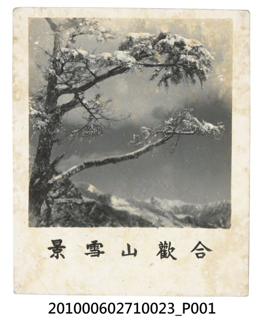 1. 本物件為合歡山雪景之黑白照。照片主體為一棵樹,枝幹間覆滿白雪,後方可見合歡山白雪皚皚的頂峰。照片下方寫「合歡山雪景」。2. 合歡山,合歡山國家森林遊樂區位於花蓮縣與南投縣交界,海拔高2300至3400公尺,面積457.61公頃,是全臺最高之國家森林遊樂區。