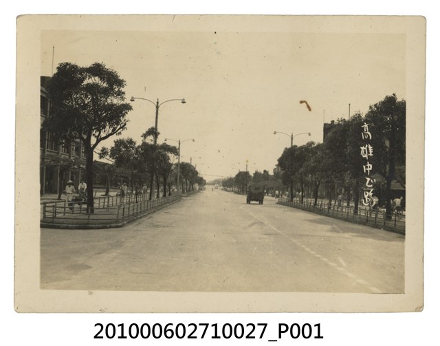1. 本物件為高雄中正路之黑白照。道路兩側為植有樹木之分隔島,路燈亦架設其中。左、右側可見建物與步行或乘自行車之行人。中間道路有汽車行駛。照片右側寫「高雄中正路」。2. 高雄市中正路,是高雄市主要的東西向幹道,是現今高雄市金融、行政機關集中的主要街道。