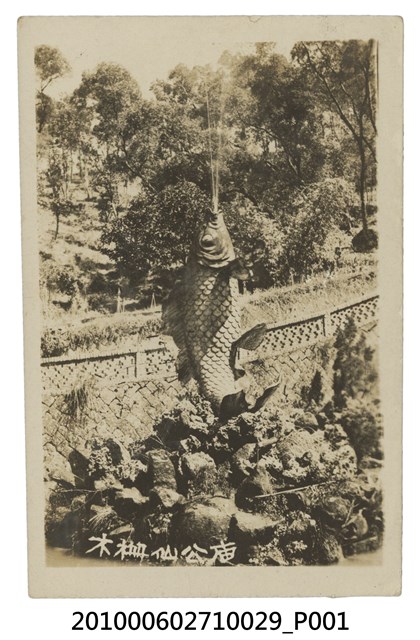 1. 本物件為木柵仙公廟一景之黑白照。主體為一噴水池,有一躍身直立於石塊上的鯉魚塑像,自口中噴出水柱。照片左下方寫「木柵仙公庙」。2. 指南宮,俗稱仙公廟,為道儒釋三教共尊,主祀神為呂洞賓,又稱呂仙祖、孚佑帝君。據日文史料紀載,指南宮位於深坑庄木柵南方的猴山石碣頭上,俗稱仙公廟,是光緒17年(1891)所建但年久荒廢,待大正9年(1920)進行整修,廟宇結構壯麗。