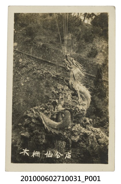 1. 本物件為木柵仙公廟一景之黑白照。主體為一噴水池,堆疊的石塊路有一盤曲著身體的龍,從口中噴出水柱,身體下方有「禹門」二字。照片下方寫「木柵仙公庙」。2. 指南宮,俗稱仙公廟,為道儒釋三教共尊,主祀神為呂洞賓,又稱呂仙祖、孚佑帝君。據日文史料紀載,指南宮位於深坑庄木柵南方的猴山石碣頭上,俗稱仙公廟,是光緒17年(1891)所建但年久荒廢,待大正9年(1920)進行整修,廟宇結構壯麗。