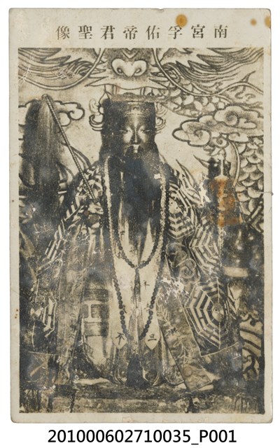 1. 本物件為孚佑帝君神像之黑白照。孚佑帝君神像頭戴純陽巾,著八卦圖案外袍,胸前掛有兩串佛珠,右手持拂塵。佛龕後方有雲紋龍圖像。照片上方印「南宮孚佑帝君聖像」。2. 呂洞賓,又稱呂仙祖、孚佑帝君。儒教稱其為純陽夫子、純陽大仙;佛教稱其為文尼真佛;道教尊其為妙道天尊、純陽帝君。