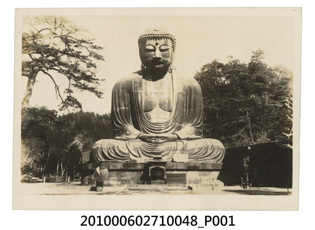 1. 本物件為鐮倉大佛之黑白照。大佛結跏趺座,雙手結印,置於一平臺上,平臺前方置有一似香爐物。左前方有一撐傘女子。2. 鎌倉大佛,是位於日本神奈川縣鎌倉市的高德院內的銅造阿彌陀佛如來坐像,據傳始建於1252年。大佛像高約13.35公尺。