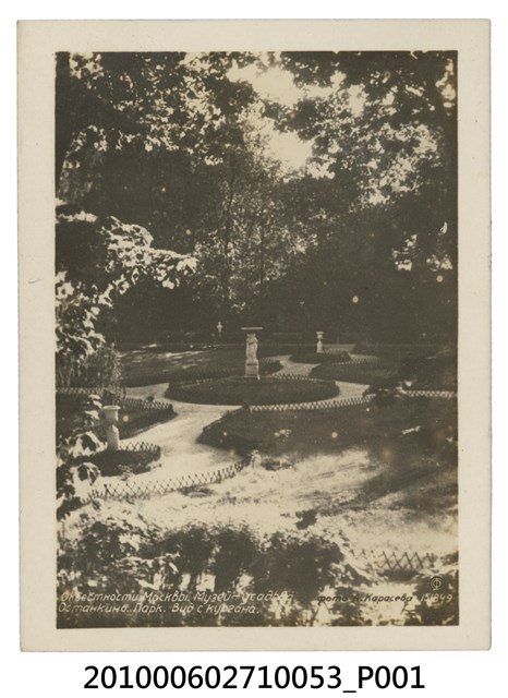 1. 本物件為奧斯坦基諾之莊園黑白照。庭園穿梭的小徑中,被低矮圍籬圍住的圓形花圃中置放不同雕像。照片下方印有俄文說明。2. 奧斯坦基諾莊園博物館(俄文:Музей-Усадьба Останкино,英文:Ostankino)位於俄羅斯莫斯科,建於1791年至1798年。1918年改為宮殿博物館。建築群中心是一幢全木結構的三層樓房,具有典型的俄羅斯風格。