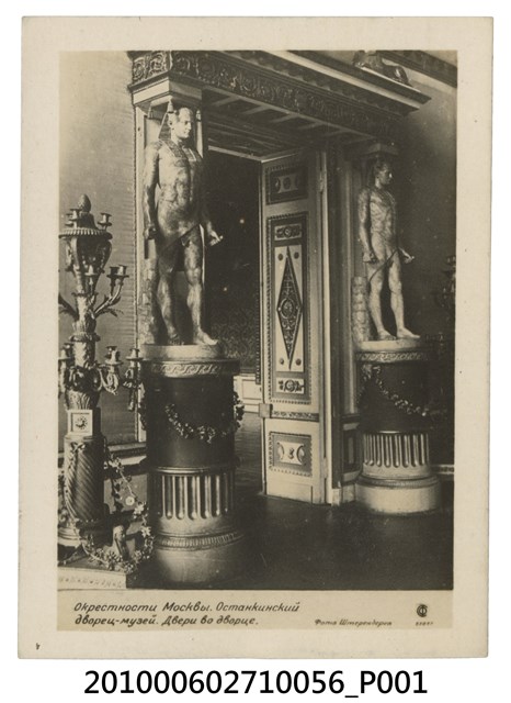 1. 本物件為奧斯坦基諾莊園之黑白照。華麗的門扉上飾有精美的圖案,門的兩側各有一與門等高、立於飾柱上的埃及人像。左側有一盞飾有埃及人物、花草圖形的蠟燭架。照片下方印有俄文說明。2. 奧斯坦基諾莊園博物館(俄文:Музей-Усадьба Останкино,英文:Ostankino)位於俄羅斯莫斯科,建於1791年至1798年。1918年改為宮殿博物館。建築群中心是一幢全木結構的三層樓房,具有典型的俄羅斯風格。