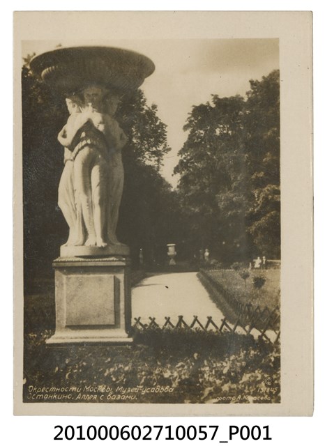 1. 本物件為奧斯坦基莊園之黑白照。左側為一三位女子頭頂圓盤的雕像,置放於以矮圍籬圍起的花圃內。後方有一小徑,後方可見其他雕像與花圃。照片下方印有俄文說明。2. 奧斯坦基諾莊園博物館(俄文:Музей-Усадьба Останкино,英文:Ostankino)位於俄羅斯莫斯科,建於1791年至1798年。1918年改為宮殿博物館。建築群中心是一幢全木結構的三層樓房,具有典型的俄羅斯風格。