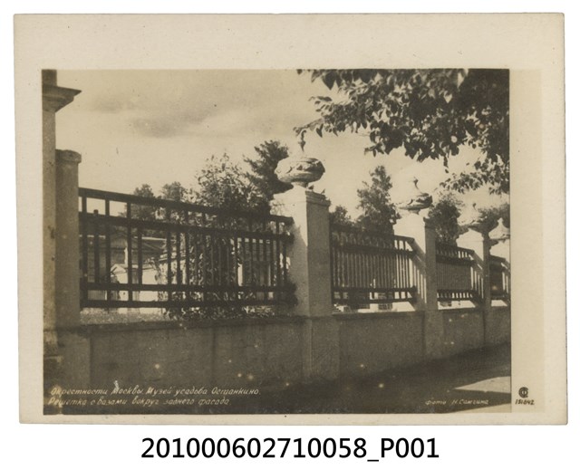 1. 本物件為奧斯坦基諾莊園之黑白照。圍牆由石柱與欄杆組成,石柱頂端有花瓶狀飾物。透過欄杆可見莊園內建物。照片下方印有俄文說明。2. 奧斯坦基諾莊園博物館(俄文:Музей-Усадьба Останкино,英文:Ostankino)位於俄羅斯莫斯科,建於1791年至1798年。1918年改為宮殿博物館。建築群中心是一幢全木結構的三層樓房,具有典型的俄羅斯風格。