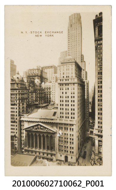 1. 本物件為紐約證券交易所之黑白照。照片中偏左方較為低矮之建物為紐約證券交易所,正面為希臘式建物風格,石柱上方可見浮雕人像。照片上方印有「N.Y STOCK EXCHANCE NEW YORK」。2. 紐約證券交易所,其總部位於紐約市華爾街,成立於1817年。