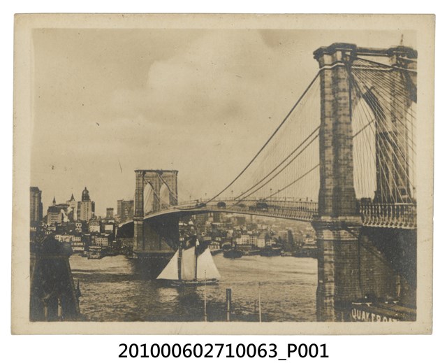 1. 本物件為紐約布魯克林大橋之黑白照。布魯克林大橋為美國最老之懸索橋之一,有兩座橋塔似為磚砌而成。橫越紐約東河連通曼哈頓與布魯克林,下方的紐約東河有各式船隻通行。2. 布魯克林大橋(Brooklyn Bridge),舊稱為東河大橋,位於紐約市,橫跨曼哈頓與布魯克林的橋梁。由建築師Roebling,John A.與Roebling,Washington A.建造,1883年完成通車。