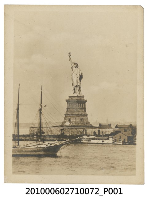 1. 本物件為紐約自由女神像之黑白照。自由女神像身著長袍,右手持火炬,左手持書冊,矗立於基座上,地點為自由島上。前方為有船隻往來的紐約港。2. 自由女神像,位於紐約市下曼哈頓區域。自由女神為法國民眾捐款建造,於1886年落成。自由女神右手高舉火炬,左手手握美國獨立日期的石碑。