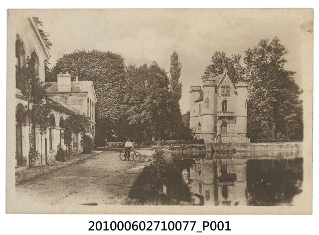 1. 本物件為白王后城堡之黑白照。右側建物為白王后城堡,為一規模十分迷你的城堡。城堡前方有一小湖,湖旁有道路,道路旁有其他建物。路上有一名戴著帽子、牽著自行車的男子,其左後方還有一名行人。2. 白皇后城堡(Château de la Reine Blanche),位於法國巴黎北部。白皇后指的應是卡斯蒂利亞布蘭奇(Blanche Of Castile,1181-1252年),布蘭奇為英王亨利二世的女兒,後與法王聯姻,為法王路易九世的母親,其對法國的發展有重大的貢獻。