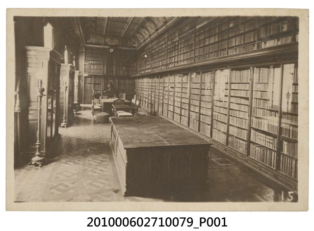 1. 本物件為尚蒂伊城(Chateau de Chantilly)圖書室之黑白照。天花板為拱形結構,繪有飾圖。前方與右方為兩層樓的書櫃,左側為窗戶及三個櫥櫃,櫥櫃旁設有立燈。中間放置兩張大桌、一張小桌與數張不同樣式的椅子。2. 尚蒂伊城堡(Château de Chantilly)位於法國巴黎,現今為美術館。尚蒂伊城堡建於中世紀,其歷經各個領主更替,與法國歷史息息相關。