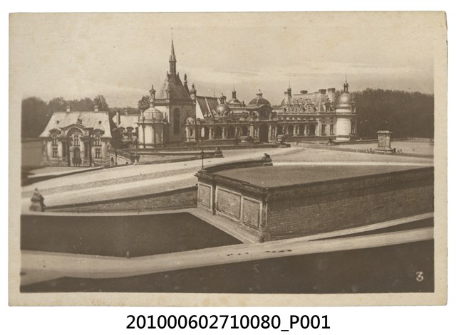 1. 本物件為尚蒂伊城堡(Chateau de Chantilly)之黑白照。中央為尚蒂伊城堡建築群,屋頂樣式有錐形、圓形,前方為寬廣的庭院。2. 尚蒂伊城堡(Château de Chantilly)位於法國巴黎,現今為美術館。尚蒂伊城堡建於中世紀,其歷經各個領主更替,與法國歷史息息相關。